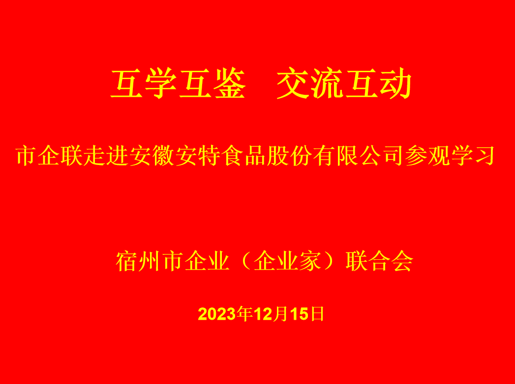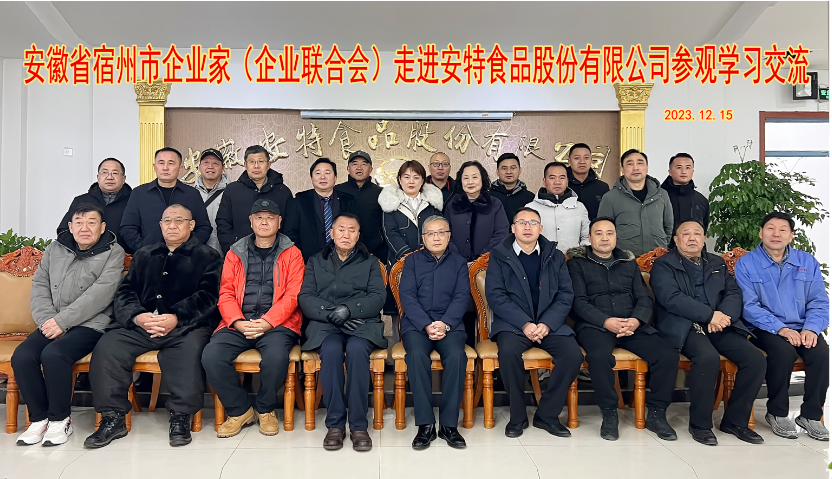 12月15日下午,市企業(yè)(企業(yè)家)聯(lián)合會(huì)組織30余家會(huì)員單位走進(jìn)安徽安特食品股份有限公司參觀學(xué)習(xí)、交流互動(dòng)。