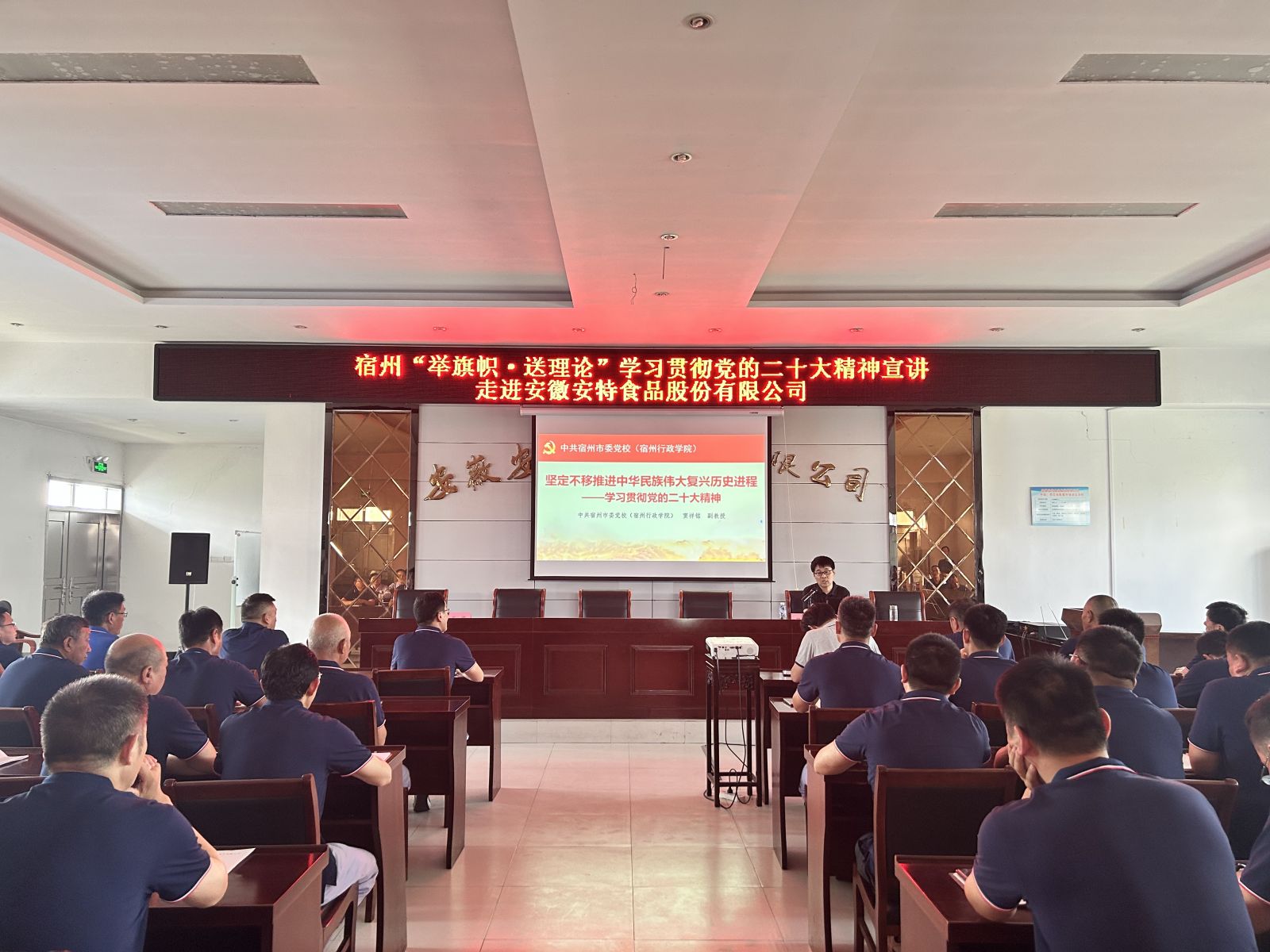 8月11日下午,宿州“舉旗幟·送理論”學(xué)習(xí)貫徹黨的二十大精神基層宣講報(bào)告會(huì)在安徽安特食品股份有限公司電教室召開(kāi)。市委黨校理論研究室主任、副教授竇祥銘作專題宣講,市經(jīng)開(kāi)區(qū)四級(jí)調(diào)研員、非公黨委副書記王浩主持會(huì)議。